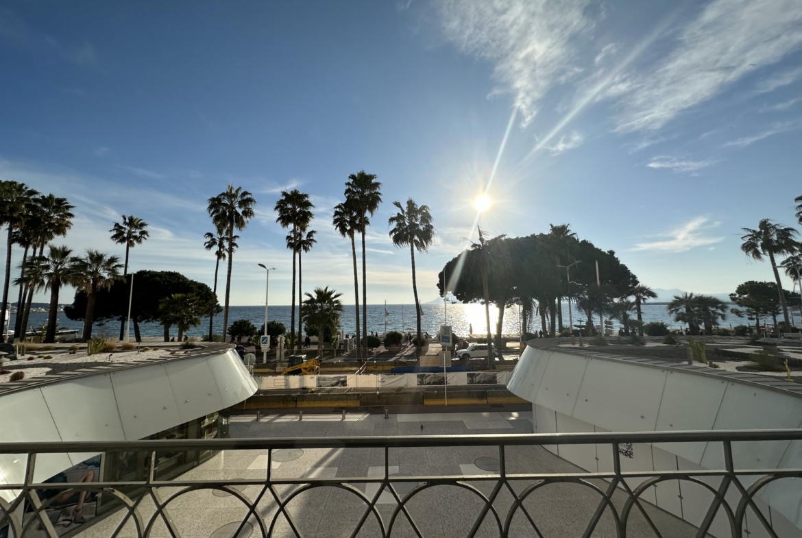 In the heart of the Croisette, in a prestigious historic palace whose Belle Epoque style blends superbly with the Art Deco style, this flat has the particularity of enjoying a large terrace facing the sea and overlooking the central square where luxury shops are located.