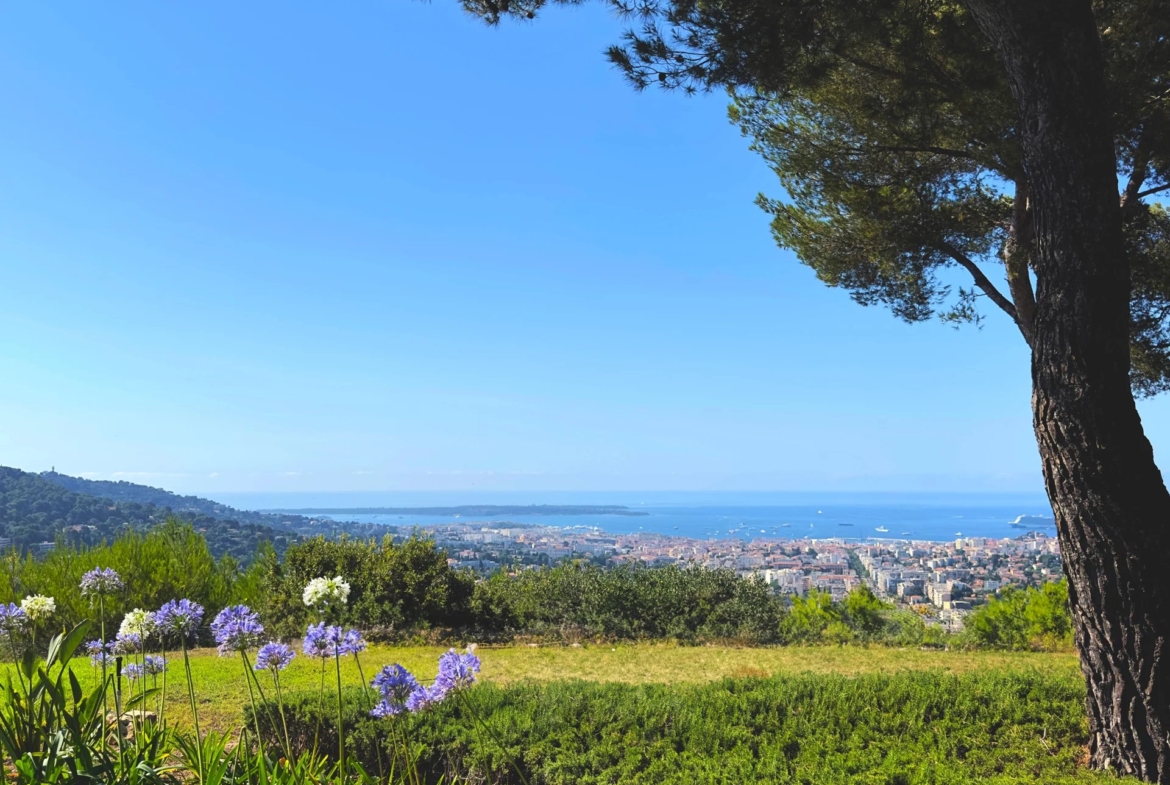 The property offers a first-row seat overlooking the Bay of Cannes, with an exceptional south-facing position where uninterrupted views sweep across the azure Mediterranean stretching to the horizon.