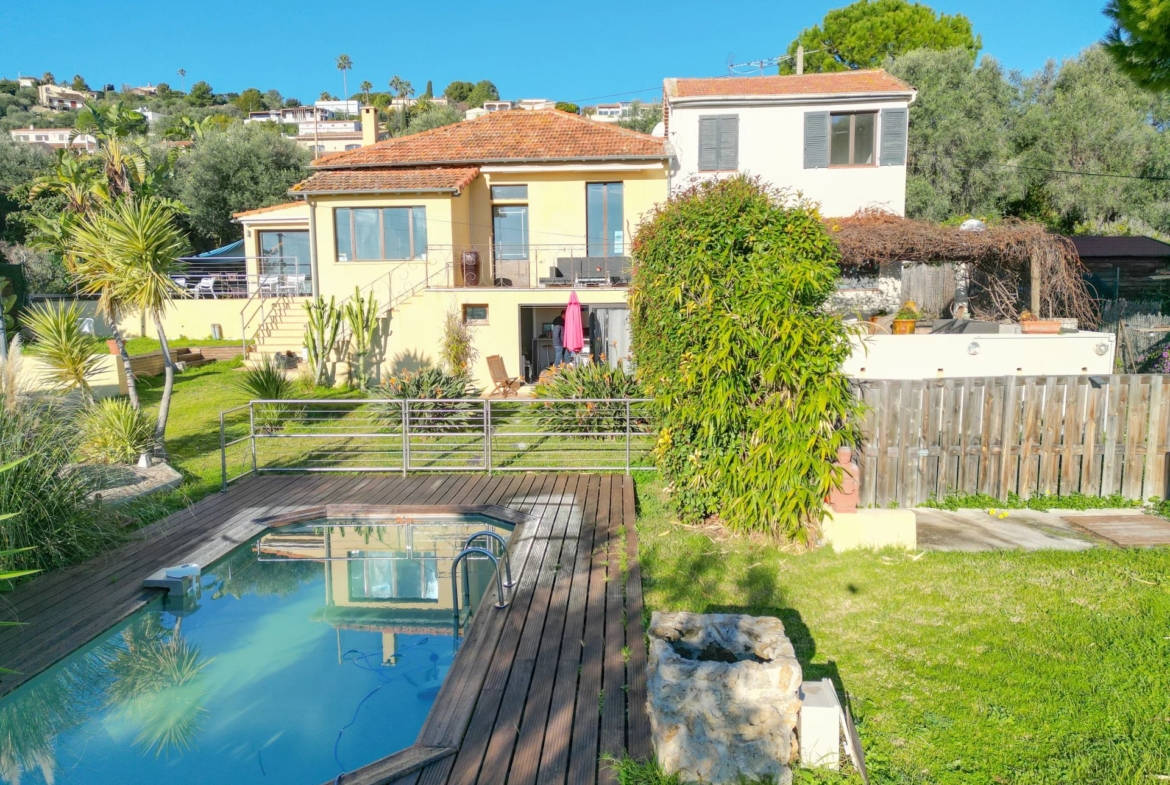 Quiet villa with sea view on the Golfe-Juan hill, several residences in one property with lovely views.