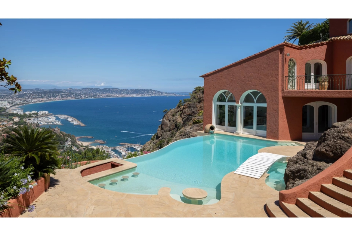 Facing the Bay of Cannes, on a hillside and out of sight, in the heart of the most sought-after gated estate in Theoule, this elegant, fully-renovated property offers exceptional views of the sea and the Estérel.